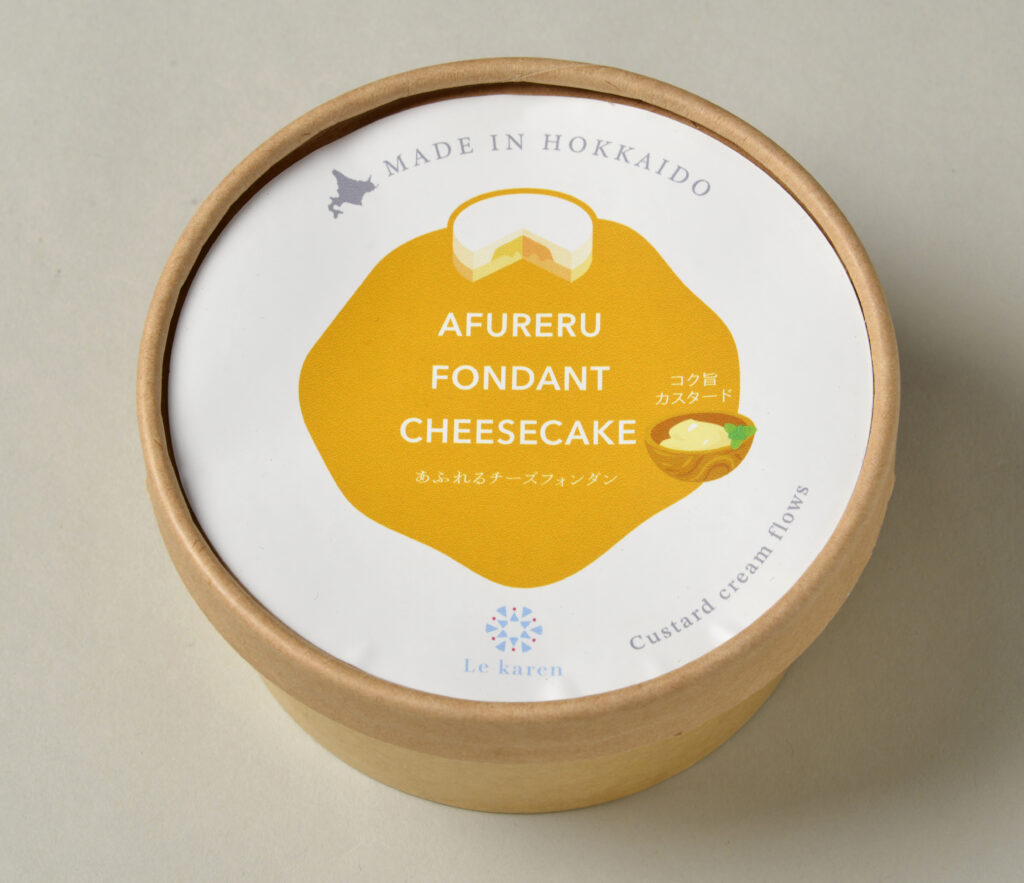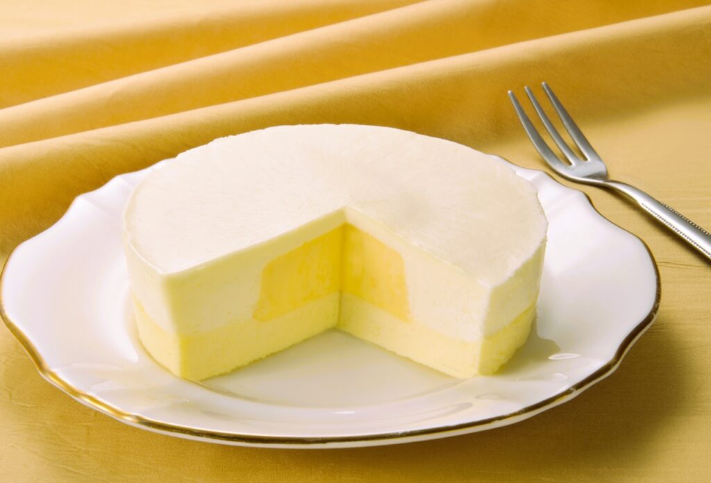 北海道原料を使用した2層のチーズケーキの真ん中をカットすると、コク生チーズカスターがあふれ出ます。ベイクチーズケーキ+生チーズケーキ+コク生チーズカスタード。
